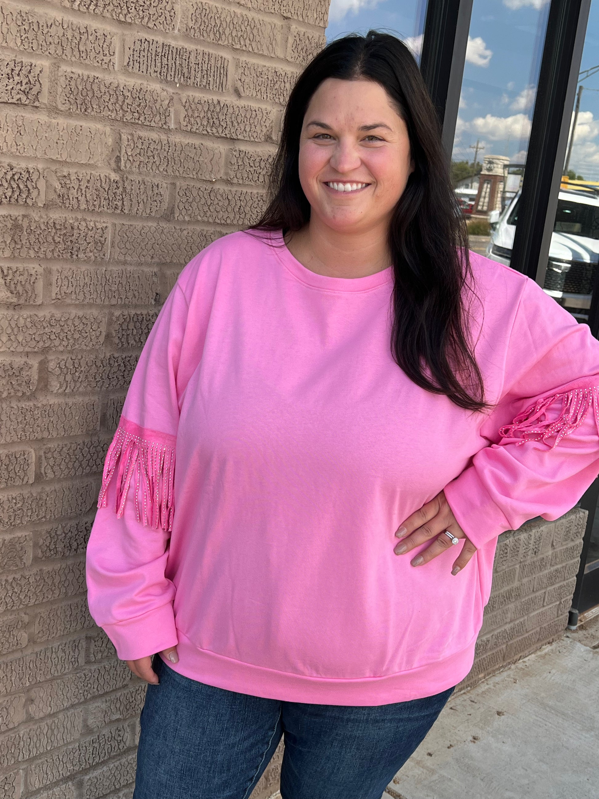 Reg & Curvy Main Strip Round Neck Sleeve & Back Stud Fringe Oversized Sweater